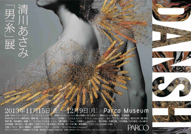 初の男性作品のみの展覧会。いつもの清川あさみの「美女採集」とはまた違った、ダイナミックでクールな「男糸」的な世界を、糸、映像(?)、言葉で表現する予定です。様々な分野で活躍する個性的な男性陣の魅力に浸って頂ければウレシイです。